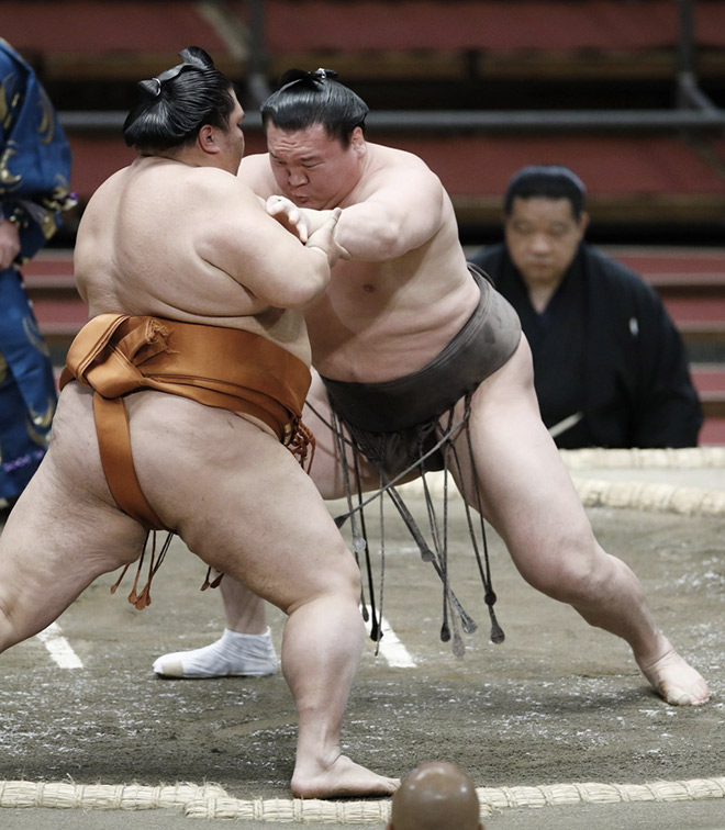 In the first career meeting between the pair, Kakuryu (5-2) rammed his smaller opponent backward and kept him at a distance before shoving him to the ground.