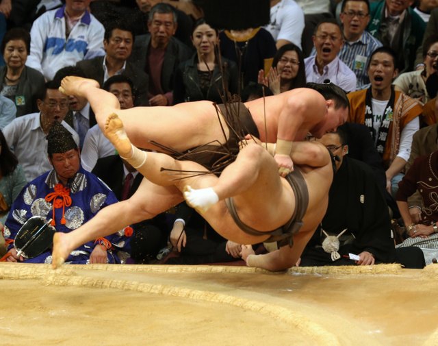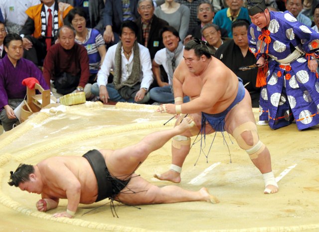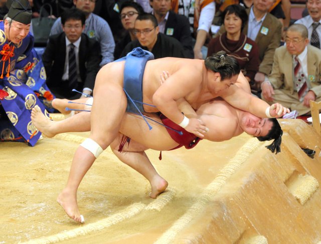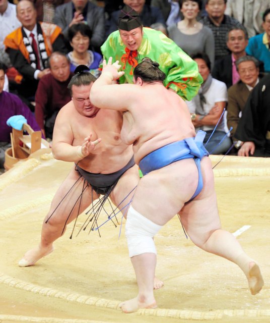 Repoussé sur les rebords du dohyô, Hakuho était en position extrêmement délicate destiné à perdre mais le yokozuna a renversé les rôles en vrillant, écrasant Okinoumi par yaguranage, une technique rare parfaitement exécutée.