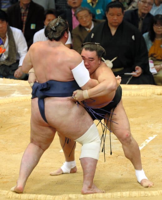 But Hakuho came through right at the death and turned the tables on Okinoumi to squash him at the ring’s edge with a rare « yaguranage » inner thigh throw technique.