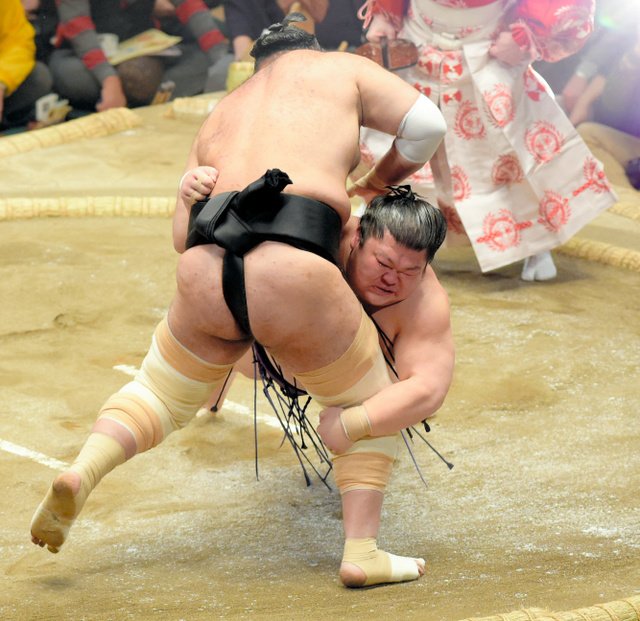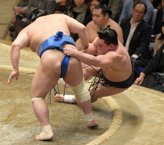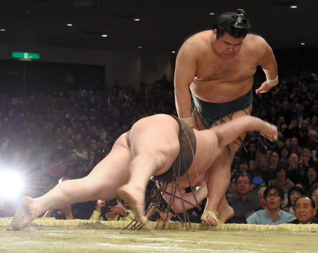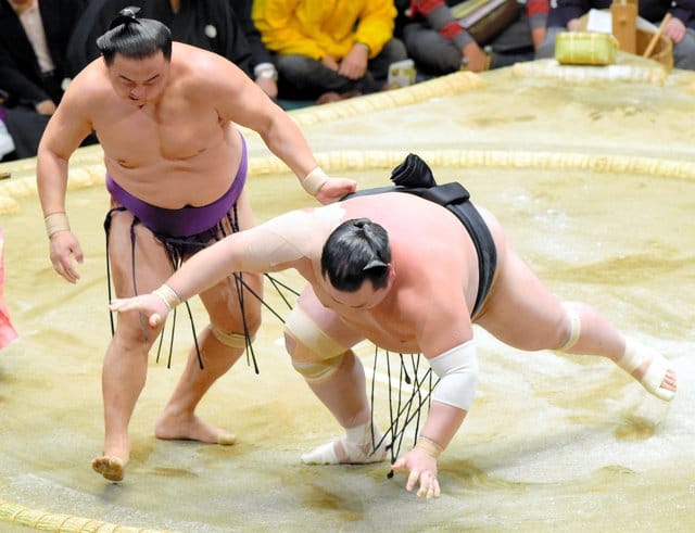 Hakuho drove komusubi Takayasu (2-5) out of the ring after a slightly sloppy bout that ended with his opponent stepping out as the yokozuna himself plopped to the ground. For the second time this tournament, the match was so close that the referees had to huddle to confirm that the Mongolian was actually the winner.