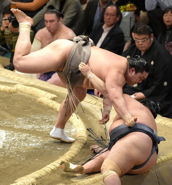 Harumafuji tumbles to first loss, Hakuho takes lead at New Year's Sumo