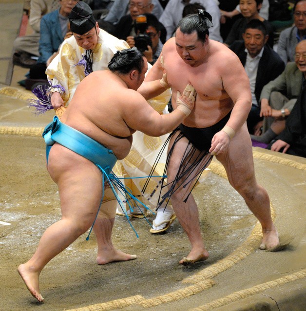 Hakuho made a rare false start against his frequent victim Aoiyama (2-5), and was repeatedly put on back foot by the No. 3 maegashira. But the Bulgarian inexplicably lost his balance trying to charge and floored himself for his 16th loss in 17 career bouts against the yokozuna.