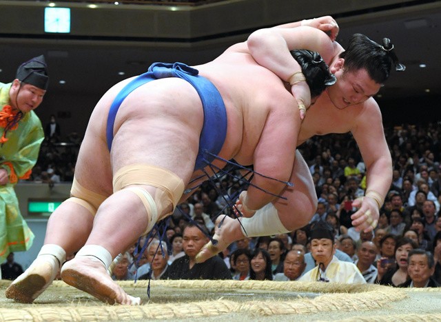 Second-ranked maegashira and Kumamoto-native Shodai earned his first win, beating injury-plagued ozeki Terunofuji (2-5). The ozeki showed signs of improvement with his initial charge but was thrust down for his fifth straight defeat.