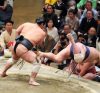 Le yokozuna Hakuho a dominé une fois de plus son compatriote Tamawashi après un échange de gifles entre les deux hommes. Le nouveau sekiwake s’est montré audacieux mais le yokozuna a réussi à esquiver une autre charge de Tamawashi dont le pied est sorti prématurément du cercle.