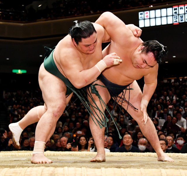 Up-and-coming No. 1 maegashira Mitakeumi (4-3) had beaten two yokozuna and ozeki each so far but fell to ozeki Terunofuji (3-4) in the last of his seven straight bouts against the sport’s top two ranks. Mitakeumi did well but the Mongolian locked up his arms before pushing him off the raised ring.