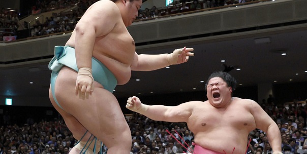 Dans un affrontement précédé de près d’une minute de postures et de regards, Kotozakura a pris un départ prudent contre le petit maegashira 4 avec un énorme sac de ruses, et cela a failli lui coûter cher. Ura repoussa Kotozakura jusqu’au bord du ring mais ne put ni l’attraper ni le renverser. Dans un effort pour sortir de l’impasse, Ura, qui avait pourtant une prise mortelle sur le bras droit de l’ôzeki, a essayé d’utiliser cette prise pour tirer Kotozakura vers le bas. L’ôzeki, cependant, se précipita en avant précisément au bon moment, envoyant Ura chanceler et le plaçant dans une position intenable face au bord du dohyô. Kotozakura est désormais à une victoire des leaders du Natsu Bashô au Ryogôku Kokugikan de Tokyo.