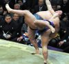 En faisant un pas de plus vers un potentiel 36ème titre, le yokozuna s’est facilement imposé face à son compatriote après l’avoir saisi rapidement à l’aide de sa main gauche avant le projeter au sol.