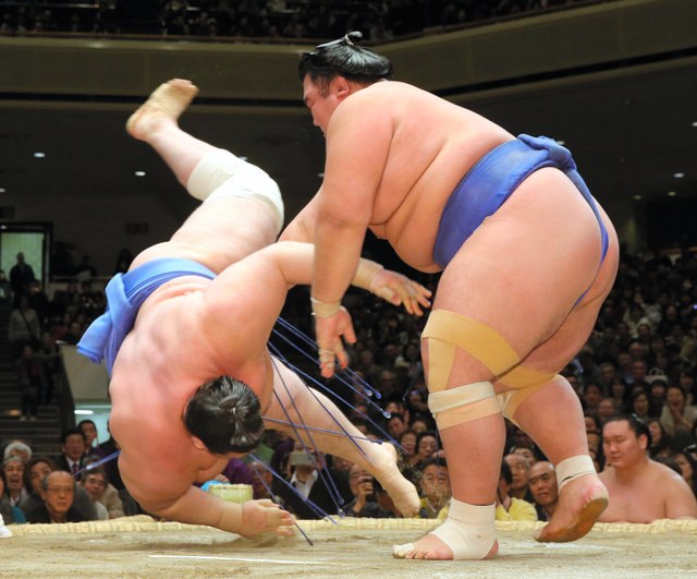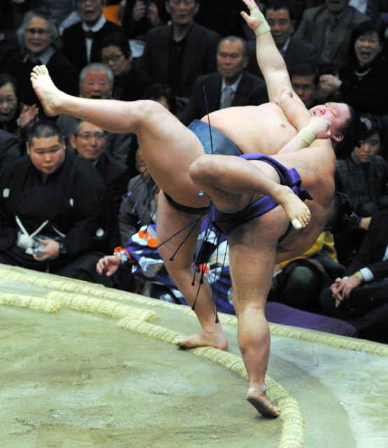 The third Mongolian yokozuna, Kakuryu (5-2), allowed a firm left-hand grip on his belt to komusubi Tochinoshin (2-5) and saw his feet almost off the ground at one stage, but managed to grab the Georgian’s belt with his right hand before reversing things with an outside leg trip.