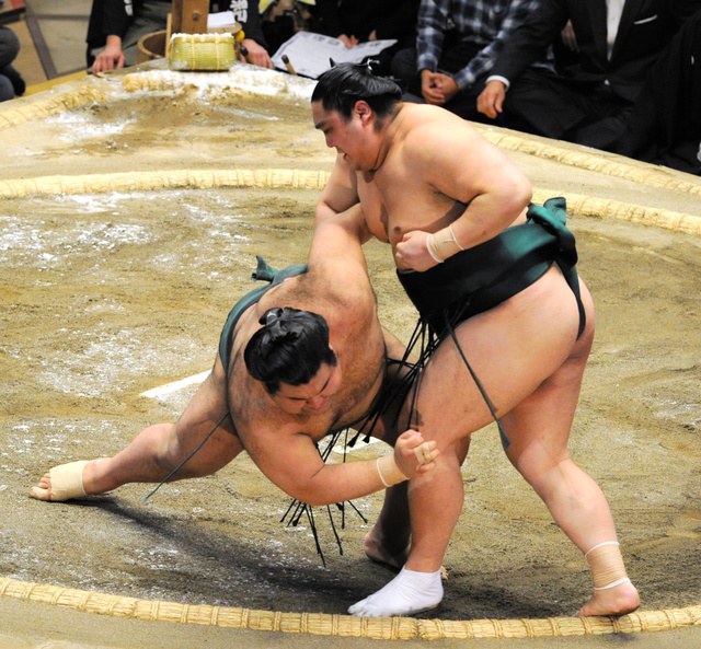 Kotoshogiku labored to down winless Bulgarian No. 2 Aoiyama following an early scare, when he failed to pull down the maegashira and saw his charge halted. A thrust down with his right arm spared the ozeki’s blushes in the end, however, to keep him at the top of the leader board.