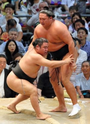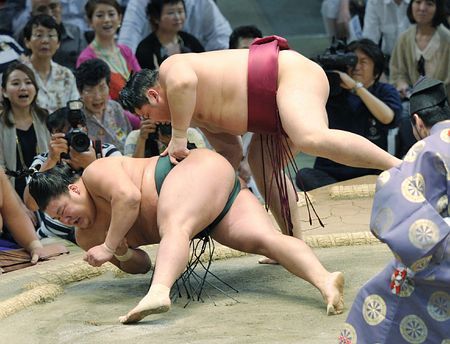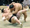 Ozeki Kotoshogiku fell behind in the win column again after second-ranked Takayasu (3-4) dodged him from the tachiai and was sent flying off the hill. Kotoshogiku needs a winning record at this basho to retain sumo’s second-highest rank.