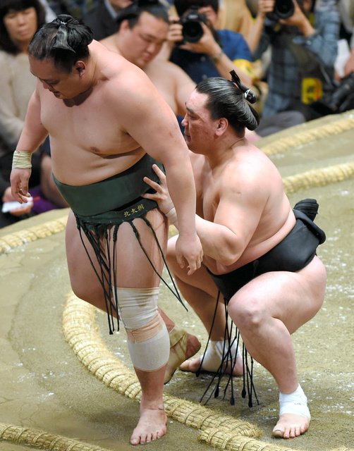 Harumafuji had his hands full early on against Kitataiki (2-5), but once the yokozuna had spun the fifth-ranked maegashira around and got control from behind it was game over.