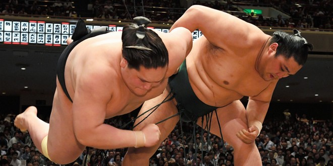 Hakuho and Kisenosato are one win ahead of a yokozuna Harumafuji and ozeki Goeido. Yokozuna Kakuryu rebounded from Saturday’s loss to Kotoyuki by outlasting Bulgarian-born No. 3 maegashira Aoiyama (2-6) and is in a five-way tie for third at 6-2.