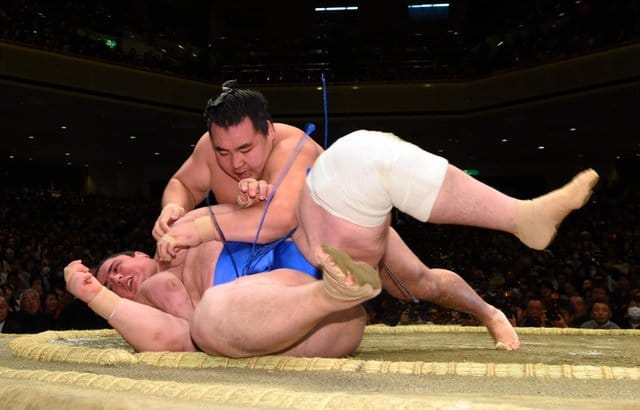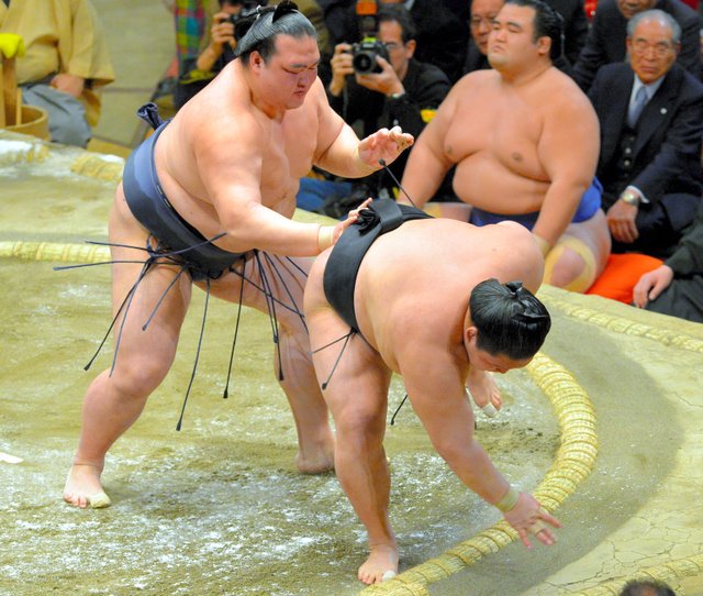 Sumo’s junior yokozuna, Kakuryu, closed the day’s action at Tokyo’s Ryogoku Kokugikan arena, with Emperor Akihito and Empress Michiko looking on, by pulling sekiwake Aoiyama into a somersault for his sixth win. Aoiyama is 3-5.