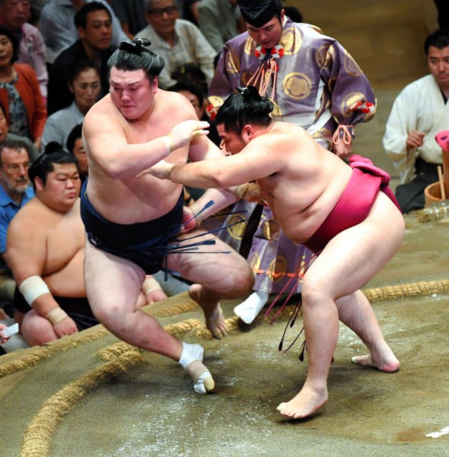 Looking back to his best after a couple of early hiccups, Kisenosato was dominant in his bout against Myogiryu (2-6), slapping the fourth-ranked maegashira around and serving up a meaty blow that forced him to hit the dirt with both hands.
