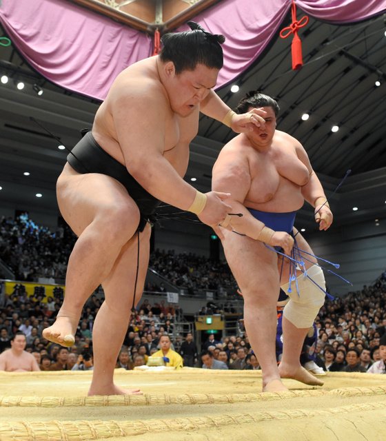 Hakuho, who is seeking his 34th career title, closely eyed Toyonoshima (6-2) as he kept him at bay with his thrusts before using his left for a chokehold to send his opponent fleeing over the ridge in front of a packed house at Bodymaker Colosseum.