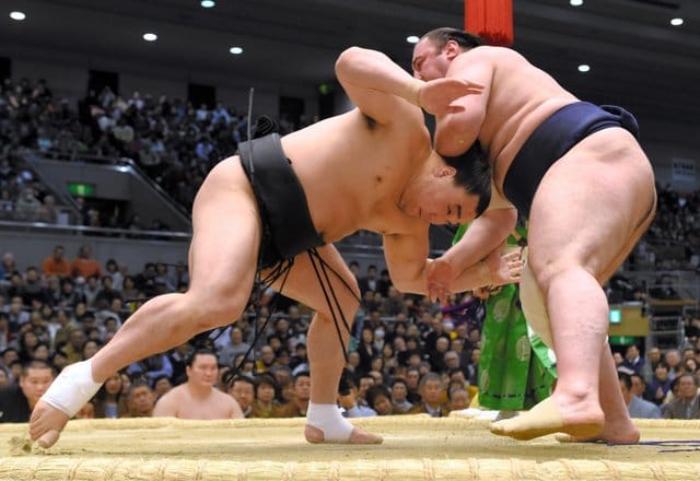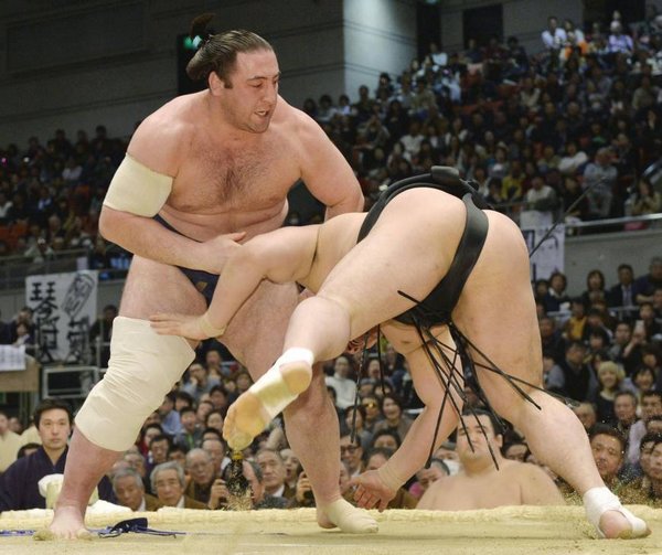 Goeido (5-3) was the lone ozeki casualty when he tried to grapple Aoiyama (2-6) at the tachiai but was sent reeling over the straw bales with a series of thrusts in front of his hometown fans. Kotoshogiku manhandled Takekaze, who slipped to a pitiful 1-7 mark.