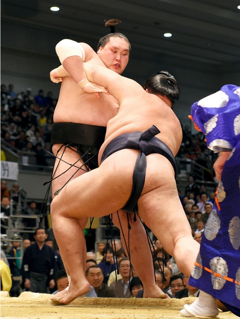 Ozeki Kisenosato (5-3) displayed superior strength against Terunofuji, hoisting the Mongolian wrestler over the edge with his leverage when the latter made an ill-advised decision to switch hand positions for a counterattack.