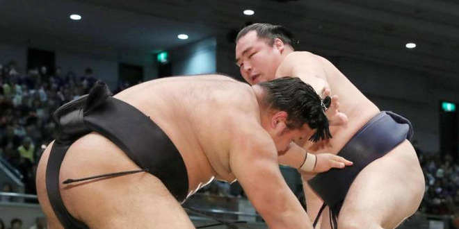 Osaka native and ozeki Goeido (6-2) got the best in a tough match with former ozeki and No. 3 maegashira Kotoshogiku (2-6). Goeido wrapped up his longtime rival’s torso on the opening collision and gradually worked Kotoshogiku out in their 48th career bout.