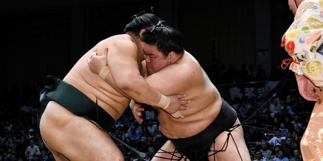 Kakuryu a remporté son combat contre le komusubi Tamawashi mais a dû s’accrocher pour l’obtenir. Kakuryu a été chassé autour de l’anneau avant de reculer ce qui a fait glisser à terre Tamawashi qui s’était penché trop loin pour atteindre son adversaire.