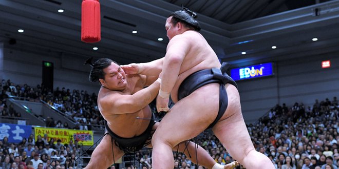 Neither man gained any advantage from a deliberate opening charge, but Kotoshogiku seized the initiative. Taking advantage of his low center of gravity, good balance and footwork, Kotoshogiku bellied his opponent to the bales and over as the No. 2 fell to his sixth defeat.