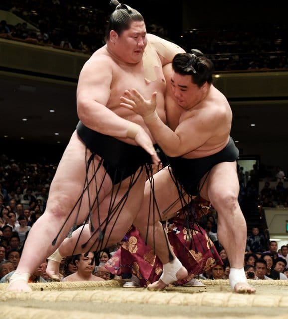 Goeido (5-3) bounced back from Saturday’s defeat by beating fourth-ranked maegashira Tokushoryu (4-4) with a routine underarm throw, but Kotoshogiku (4-4) squandered the chance to complete an ozeki sweep when he was sent sprawling to the dirt by second-ranked maegashira Toyonoshima (3-5).
