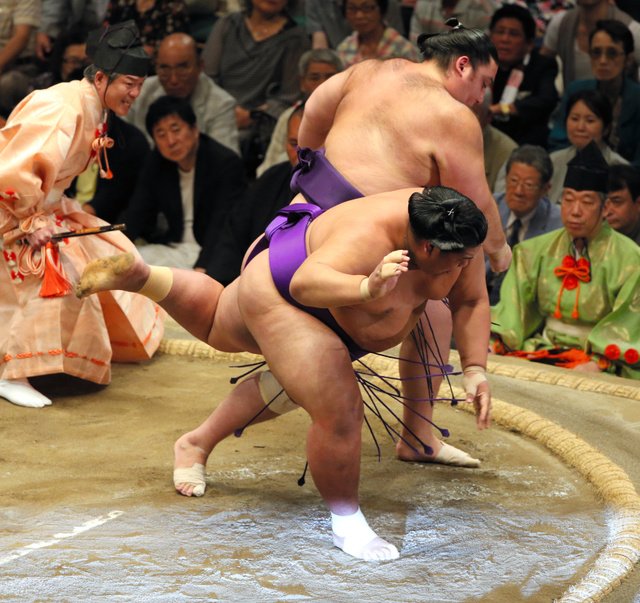 TOKYO (Kyodo) — Idle Hakuho was gifted a seventh win and fellow Mongolian grand champion Harumafuji also stayed in the leading pack after barging out Ichinojo at the Summer Grand Sumo Tournament on Sunday.