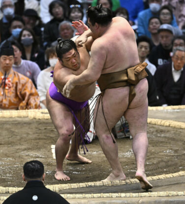 Après sa première défaite hier, Onosato devait se rattraper. C’est chose faite, même si son adversaire du jour Tamawashi lui a posé bien des problèmes. Ses mains hautes ont failli avoir raison de la vitesse que le jeune lutteur aime mettre dans ses combats. Il est finalement parvenu à faire comme d’habitude : tout droit tel un bulldozer en encaissant les coups, indifférent.