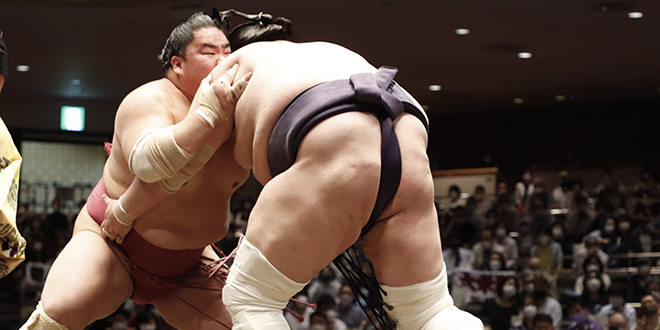 Les deux autres ozeki n’ont pas été aussi chanceux. Shodai (5-3) n’avait pas de réponse convaincante contre le komusubi Mitakeumi (6-2).