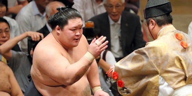 L’ôzeki kadoban Kotoshogiku, le sekiwake Takayasu et le maegashira 8 Kotoyuki sont également à deux défaites.