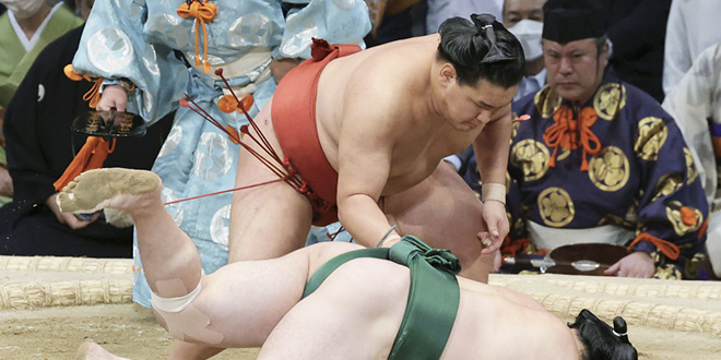 Dans le combat de clôture de la journée, Tobizaru (5-4) a sorti Takakeisho de son style préféré en transformant la rencontre en un échange de gifles. Le komusubi a continué d’avancer alors que le duo s’échangeait des coups, poussant finalement l’ôzeki par-dessus le dohyô.