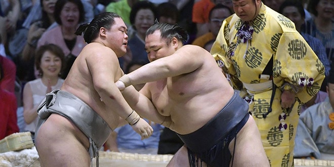 Takayasu, fighting with a heavily-wrapped left arm following an injury scare in Sunday’s bout with Tamawashi, drove Shodai to the straw, but he was eventually tossed aside while showing signs of severely limited mobility.
