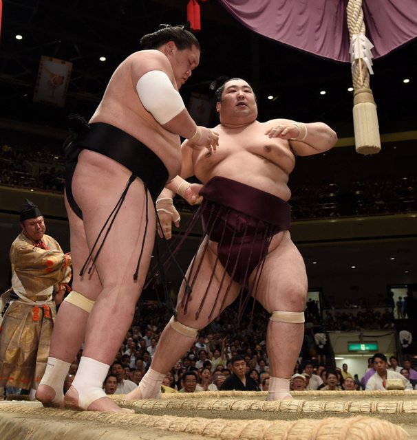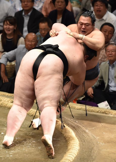 Harumafuji was forced out by Tamawashi, the yokozuna’s foot just overstepping the rope as his opponent used his weight advantage to full effect.