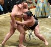 L’ôzeki Kotoshogiku, qui risque d’être rétrogradé au rang de sekiwake, est parvenu à battre son homologue Kisenosato grâce à une charge solide et des poussées répétées à l’aide de son torse.