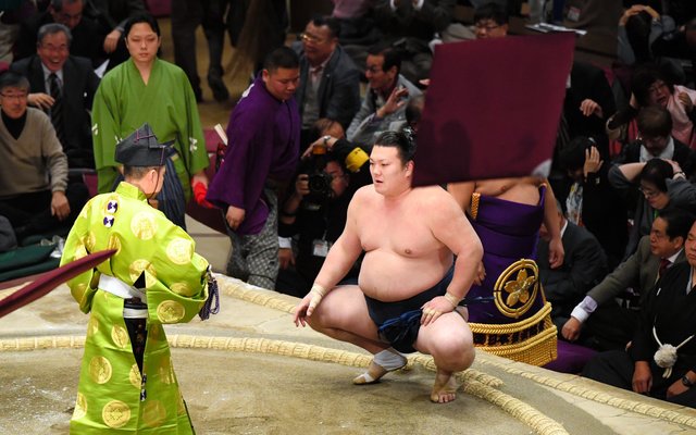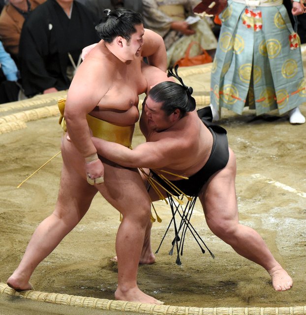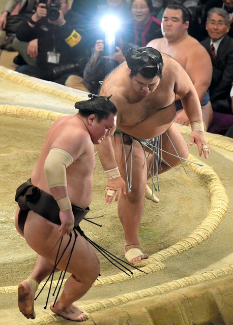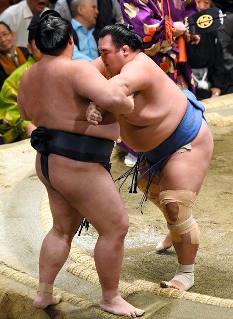 Ozeki Kotoshogiku (3-6), who will be demoted from the second-highest rank should he post a losing record at Ryogoku Kokugikan, forced Kisenosato out to his first loss after a solid charge and trademark grapple, in which he batters his opponents with his torso.