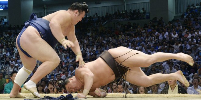 Harumafuji tasted defeat in similar fashion in the day’s final bout, as No. 5 maegashira Yoshikaze kept the Mongolian off his mawashi and sent him crashing to the floor as Harumafuji lunged for an inside position.