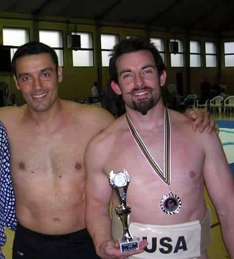 Je m’entraîne aussi à l’étranger où j’ai porté ouverte comme on dit, au sein du Judo Club Milano, à Milan en Italie. Sous la direction de Fausto Gobbi (4 fois champion d’Italie de Judo et médaillé d’argent aux jeux européens de sumô). Il est vraiment excellent dans l’enseignement, possédant un bagage technique important, il me conseille et me fait progresser en yotsu-sumô (sumô avec prise sur la ceinture). Grâce à lui, j’ai pu effectuer une longue série de moshiai-keiko (spamming) avec Dan Kalbfleich. Le champion américain m’a bien entraîné et conseillé notamment sur l’aspect tactique et technique. Ce fut très instructif.