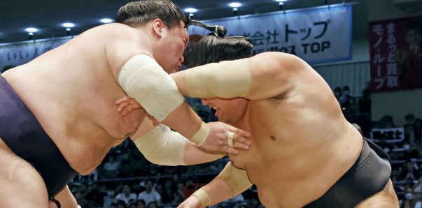 Wakamotoharu a contenu une charge féroce de l’ancien ôzeki Mitakeumi, s’accrochant à sa ceinture à deux mains et forçant ensuite le maegashira 2 à la paille jusqu’à ce qu’il tombe en arrière hors du dohyô.