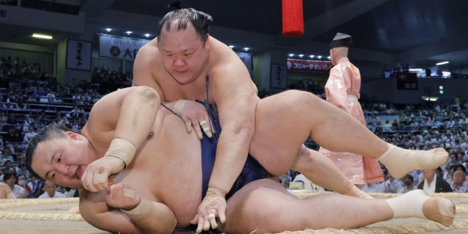 Le maegashira 9 Hokutofuji a obtenu une victoire facile contre le n°7 Tamawashi (6-4), lorsque le pied arrière du vétéran mongol a glissé sur la surface et qu’il est tombé.