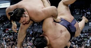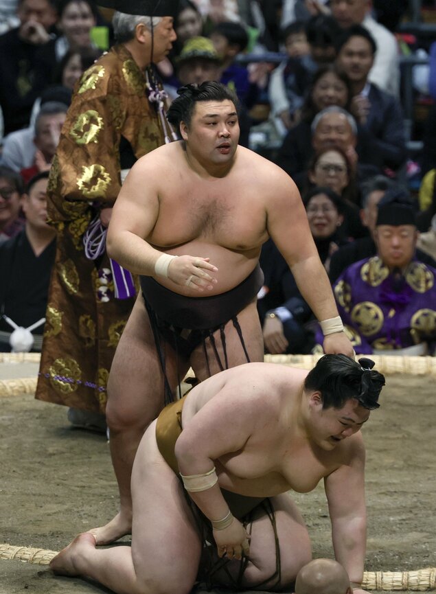 L’ukrainien Aonishiki semblait se diriger vers son premier make-koshi en sumo avant de réaliser une remontée spectaculaire pour vaincre l’autre ôzeki, Kotozakura. Moins puissant que lors de ses deux victoires précédentes, Aonishiki a été déséquilibré au bord du dohyô par une projection de Kotozakura, puis une poussée dans le dos a envoyé le lutteur ukrainien butter sur les limites en paille. Mais Aonishiki a réussi à éviter la sortie et s’est repositionné pour faire face à Kotozakura. Il a ensuite paré une nouvelle attaque, poussant son adversaire au bord du dohyô avant de le forcer à sortir.