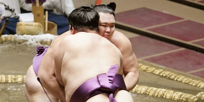 The rest of the elite-level wrestlers also fared well. Takakeisho improved to 2-0 after taking out No. 2 Onosho (0-2). The demotion-threatened « kadoban » ozeki, who needs to clinch at least eight wins to keep his rank, pushed Onosho back and then slapped him down as he tried to rally.