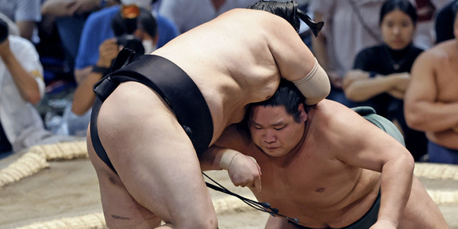 Le maegashira 1 conserve son score impeccable de 6-0 face à une succession d’adversaires de premier plan, dont les trois sekiwake et le yokozuna Terunofuji avant son retrait.