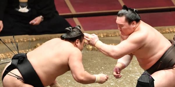 Takakeisho improved to 5-2 and now needs three more wins to keep his position at sumo’s second-highest rank. The demotion-threatened « kadoban » ozeki slipped around Kagayaki (3-4) and thrust him down as Kagayaki’s momentum carried him past.