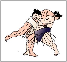L’attaquant place sa tête sous le bras de son opposant tout en assurant une prise sur le mawashi coté opposé. En poussant vers le même coté que sa prise, il essaie de faire pivoter son adversaire, et de crocheter la jambe intérieure. En même temps, il relève la tête en repoussant son adversaire sur le coté.