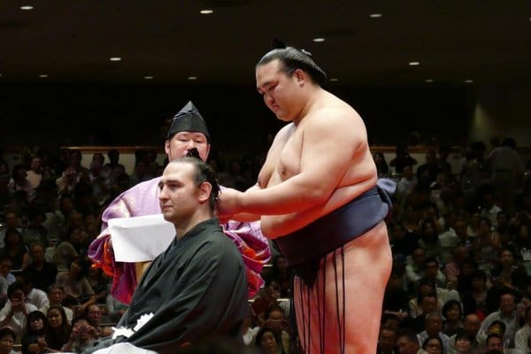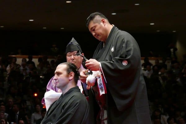 Pour lui rendre hommage, c’est pas moins de 350 personnes qui se sont succédé pour lui couper une mèche de cheveu. Parmi les invités on a pu voir ses parents, ses camarades de la Sadogatake beya, le yokozuna Hakuhô ou encore son compatriote Aoiyama. Le moment sans doute le plus émouvant est quand son père est venu sur le dohyô pour couper une mèche à son fils.