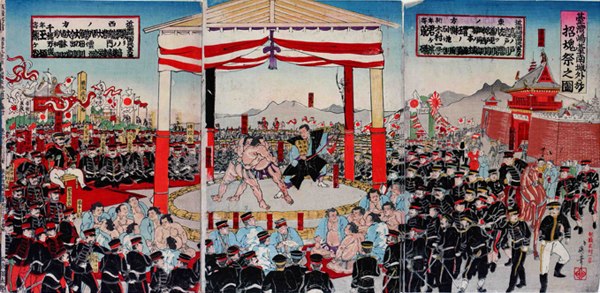 La guerre de Boshin littéralement « guerre de l’année du dragon » est une guerre civile japonaise qui débuta en janvier 1868 sous le règne de l’empereur Meiji, quelques mois après la restitution du pouvoir suprême à l’empereur, et qui se poursuivit jusqu’en mai 1869. Elle vit principalement s’affronter, d’une part, les armées des clans de Satsuma, de Chôshû, de Tosa et leurs alliés, proches de l’Empereur et, d’autre part, les troupes appartenant au gouvernement shogunal d’Edo et les clans qui lui restèrent fidèles. Les ôzeki Wakashima et Asahidake ont participé à cette guerre civile tout comme le maegashira 5 Kuwanoyumi, le komusbi Kajigahama et le sekiwake Chitosegawa. Le yokozuna Jinmaku s’était également enrôlé dans le conflit.