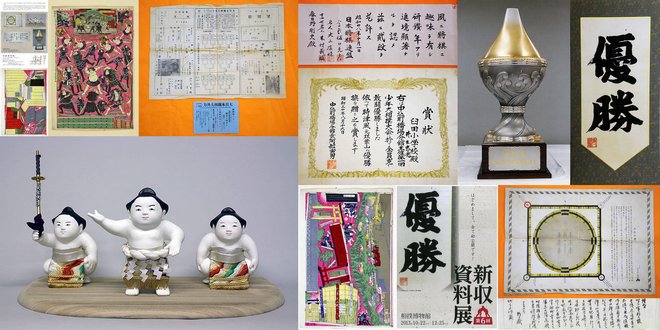 Parmi les principaux chefs-d’œuvre, on peut admirer des calligraphies exécutées par le 19ᵉ yokozuna Hitachiyama ainsi que par Futabayama accompagnées de photographies. De magnifiques estampes de Kuniteru II datant de 1868 et de Kunimasa IV représentent des sumotoris dans des scènes traditionnelles.