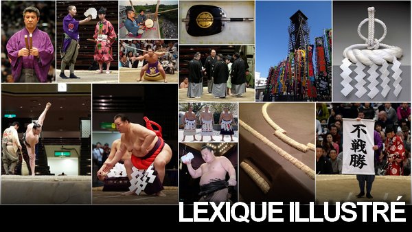 sagari (下がり) : Ficelles de tissu attachées par-dessus le mawashi. Si elles sont amidonnées, elles signalent un lutteur de la division sekitori. sandanme (三段目) : Catégorie de lutteurs apprentis. sanshô (三賞) : Prix supplémentaires accordés lors des tournois : kantô-shô, ginô-shô et shukun-shô. sanyaku (三役) : Groupe de la division makuuchi dans lequel on retrouve les rangs des lutteurs : sekiwake, komusubi. sekitori (関取) : Lutteur sumô des divisions makuuchi et juryô. sekiwake (関脇) : Rang de grand champion venant après les yokozuna et les ôzeki. senshûraku (千秋楽) : Dernier jour des combats d’un tournoi. sensu(扇子) Éventail en papier. Utilisé par les yobidashi pour appeler les lutteurs à monter sur le doyhô. Attention à ne pas confondre avec le gunbai des gyôji! shihon-bashira (四本柱) : Au départ, pilier des bords du dohyô. Cela désigne maintenant les quatre pompons : vert (nord-est), rouge (sud-est), blanc (sud-ouest),et noir (nord-ouest). shikiri (仕切り) : Position de départ et rituel avant le tachi-ai. shikiri-sen (仕切り線) : Lignes blanches indiquant les positions de départ sur le dohyô, elles sont espacées de 70 cm. shikishi (色紙) : « Autographe » d’un rikishi constitué d’une plaque carrée sur laquelle le lutteur appose sa signature et l’empreinte de sa main en rouge (tegata). shiko (四股) : Exercice d’échauffement avant le combat. Le lutteur accroupi lève la jambe droite, puis la gauche. shikona (四股名) : Nom de combat porté par les rikishi – ce n’est en général pas leur nom d’état-civil. shimekomi (締め込み) : Autre nom du mawashi lorsqu’il est en soie (pour les sekitori). shingitai (心技体) On dit que les trois éléments clé du succès d’un sumotori sont le shin -心- (pensée, cœur, esprit), le gi -技-(art, technique) et le tai -体-(le corps, le physique). Souvent rassemblés pour former le terme de shingitai, Ce sont ces trois fondamentaux qui sont au cœur du sumôdô (la voie du sumo). shinitai (死に体) Signifiant littéralement « corps mort », c’est un terme utilisé pour décrire un lutteur qui n’était pas le premier à tomber ou à sortir du ring, mais qui n’avait aucune chance de gagner en raison de la position de sa chute. shinji zumo (神事相撲) Forme primitive de sumo qui était pratiquée par les cultivateurs de riz des périodes Yayoi et Kofun (-200 – 552) pour attirer la grâce divine et s’assurer de bonnes récoltes. shinkyaku (伸脚) Exercice d’assouplissement qui consiste à se mettre accroupi et étirer une jambe puis l’autre. shinpan (審判) : Juge du bord du dohyô ; il y en a 5 pendant les combats. Shingi ou Yokozuna Shingi Iinkai (横綱審議委員会) : Conseil de promotion des yokozuna. shitaku beya (支度部屋) : Salle de préparation (vestiaires) où les lutteurs se mettent en tenue, se font coiffer et attendent leur tour avant de rejoindre le dohyô. shonichi (初日) : Premier jour du tournoi. shokkiri (初切) : Démonstration de combat à but humoristique parodiant le sumo. Deux lutteurs de divisions inférieures expliquent sous forme de sketchs tout ce qui est interdit de faire lors des matchs. Le gyôji joue également le jeu. shukun-shô (殊勲賞) : Prix de la meilleure performance au cours d’un tournoi à un lutteur maegashira sonkyo (蹲踞) : Position accroupie avec les genoux écartés en équilibre sur la pointe des pieds et les mains posées sur les genoux. Cette position est effectuée en face-à-face avant le combat. sumo jinku (相撲甚句) : Le sumo jinku est un chant traditionnel du sumo qui parle du quotidien des lutteurs et qui vante les villes où on lieu les tournois. Le refrain est toujours : ~~ ♫ ah dosukoi, dosukoi! ♪ ~~ sumo sechie (相撲節会) : Forme de sumo pratiqué devant la cour impériale durant la période Heian (794 – 1185) en même temps que le tir à l’arc et le tir à l’arc monté, l’un des trois sports « sechie » officiellement promulgués durant cette période. suri-ashi ( 摺り足) Exercice de souplesse consistant à avancer sans décoller les pieds au sol, en position mi-accroupie, jambes écartées et buste penché vers l’avant. |