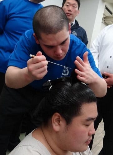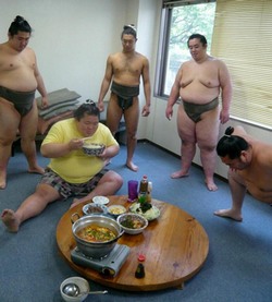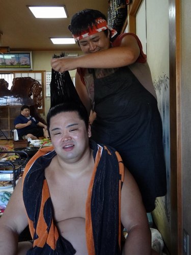 chanko-nabe (ちゃんこ鍋) : Menu typique des sumotoris très nutritif et consommé en grande quantité par les lutteurs. Il se présente sous la forme d’un ragoût constitué d’un bouillon auquel est ajouté des légumes variés ainsi que de la viande (principalement du poulet). (en savoir plus). chikara-mizu (力水) : Eau de purification, utilisé dans le rituel de pré-combat qui permet au rikishi qui va lutter de se rincer la bouche. Cette eau est offerte soit par le lutteur vainqueur du combat précédent s’il est du même côté, soit par celui qui combattra après. chiri-chôzu (塵浄水) : Geste du rituel de pré-combat, consistant à frapper ses deux mains en position accroupie, puis d’étendre les bras horizontalement avec les paumes vers le bas, ensuite vers le haut. chon mage (丁髷) : Style de coiffure des lutteurs Sumô : cheveux lissés à l’huile et chignon plat qui revient vers l’avant. |