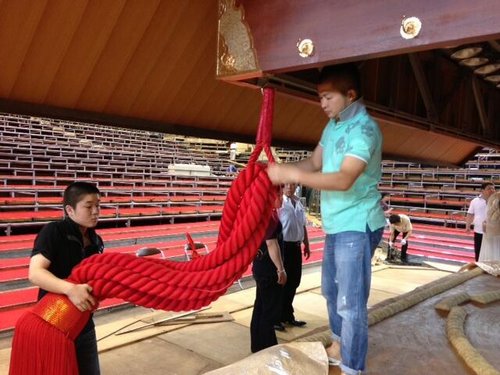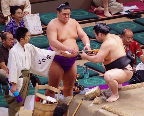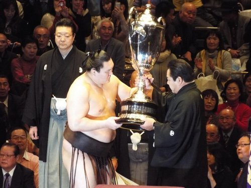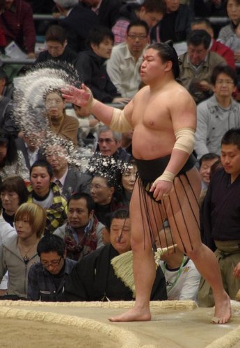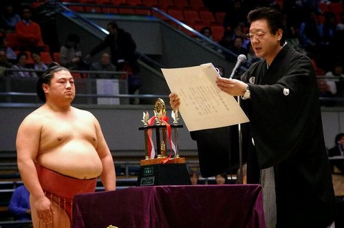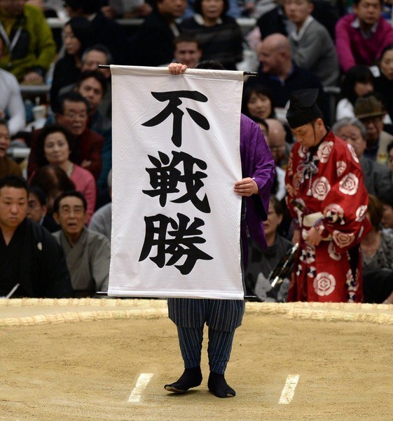 zabuton (座布団) : Coussin utilisé pour s’asseoir par terre autour du dohyô ; il est jeté par les spectateurs sur le dohyô en cas de grand combat si un yokozuna perd son combat contre un lutteur de rang inférieur. zenshô-yûshô (全勝優勝) : Tournoi gagné sans aucune défaite (15 victoires) |