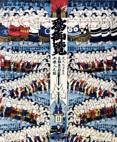 ebanzuke (絵番付) : Liste illustrée du classement, non-officielle. eboshi (烏帽子) : Chapeau des gyôji. |